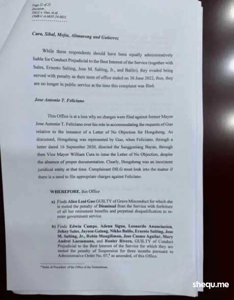在一份长达25页的决定中,菲当局宣布解雇郭市长职务、没收所有退休福利、并永久取消其担任公职的资格。
