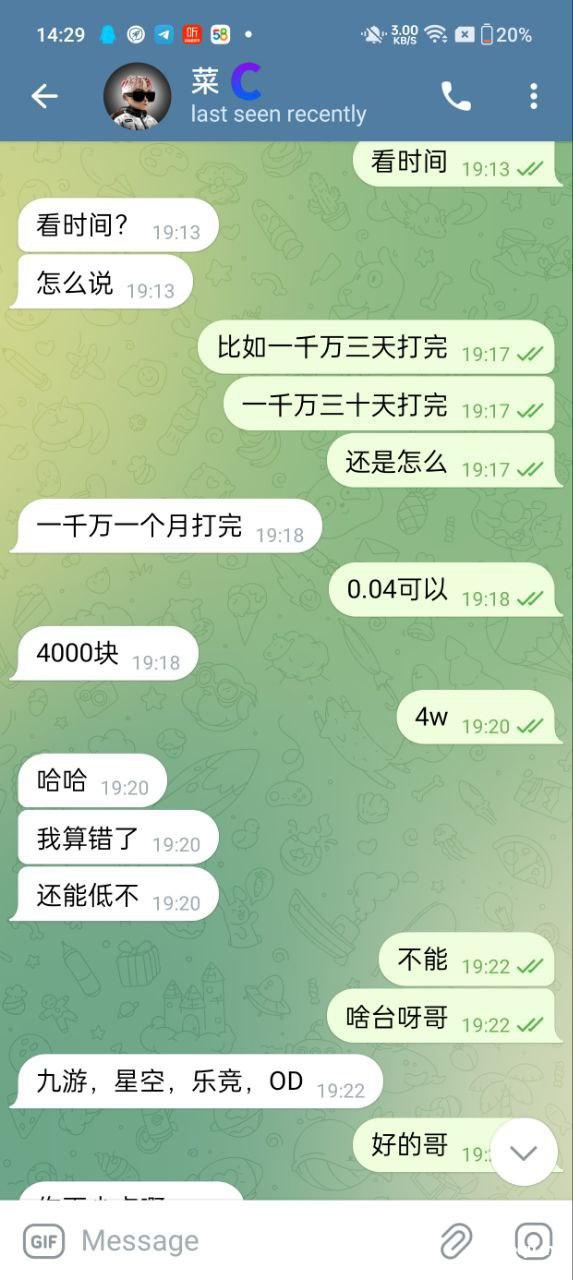 事情开始一个人渣部长做了扶持组,找我打水,一万给40大家都知道这个价格,给他打真人上千单注是很低的(图一)最开始我给他打的彩票裸杀(图二)说好给现金结果120w就给了2000,然后说剩下的彩金,此时我就意识到这个人出尔反尔能保本就不错了,所以我又再跟他确认,让他后面给现金本来就低(图三)然后他觉得光彩票裸不行,让打真人,我给他确认真人下多少他说都行(因为下的小点亏的少点)结果第二天反悔,说真人必须下大点,然后我就给他下上千一注