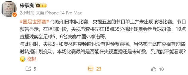 澎湃新闻记者宋承良表示:“今晚中国队和日本队比赛,央视五套的节目单上并未出现这场比赛。节目预告显示,在相同时段,央视五套将先在18点35分播出残奥会乒乓球录像,19点直播残奥会足球5、6名决赛中国vs摩洛哥。与此同时,央视5+和奥林匹克频道也没有世预赛直播。当然,鉴于此前央视有过临时转播计划变动,本场比赛最终是否能在央视直播还是未知数。”