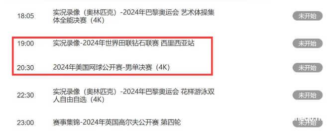 CCTV5+是国际田联钻石联赛和美网男单决赛重播;奥林匹克频道是巴黎奥运会游泳和女子曲棍球半决赛实况录像。